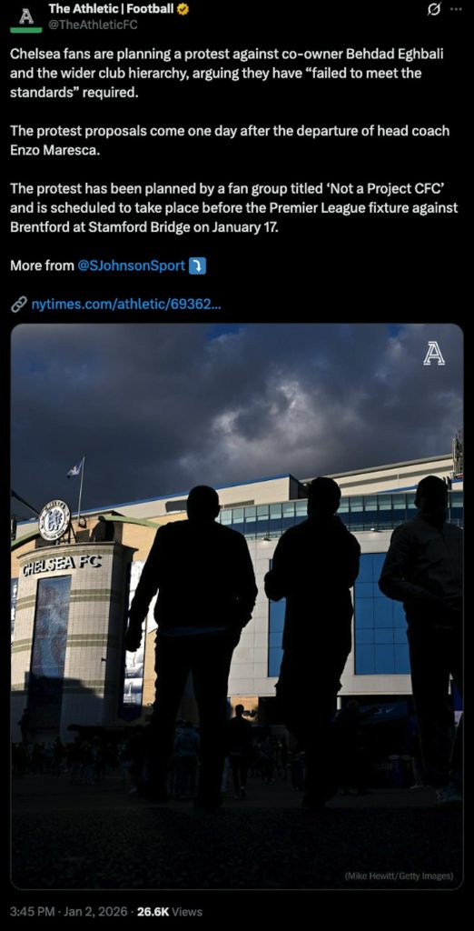 Theo các nguồn tin đáng tin cậy từ truyền thông Anh, một bộ phận lớn cổ động viên Chelsea đang lên kế hoạch tổ chức cuộc biểu tình có quy mô đáng kể nhằm gây áp lực trực tiếp lên đồng sở hữu Behdad Eghbali cùng ban lãnh đạo đội bóng. Động thái này được xem là sự bộc phát của những bức xúc đã tích tụ trong thời gian dài, liên quan đến cách Chelsea được vận hành kể từ khi bước sang kỷ nguyên mới.